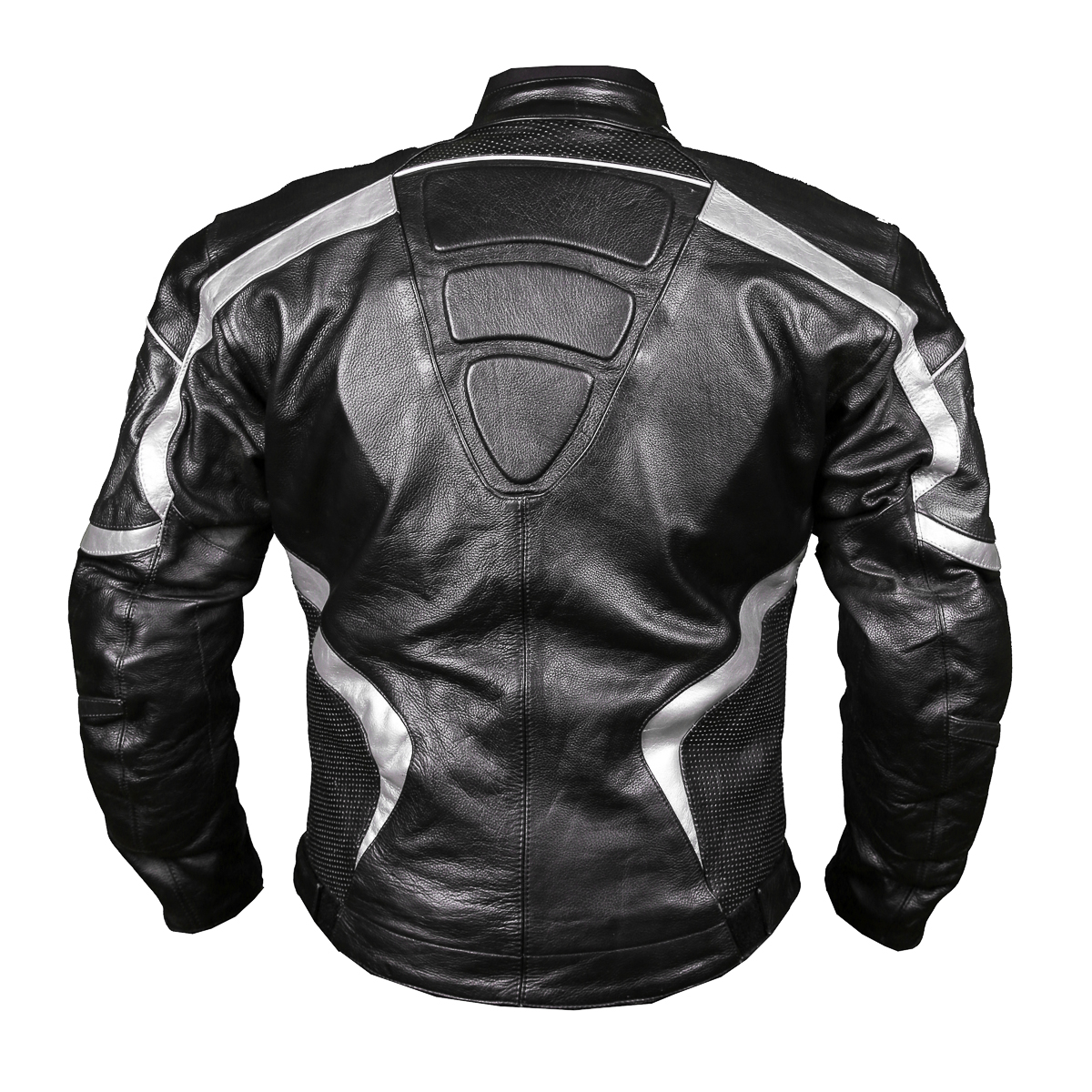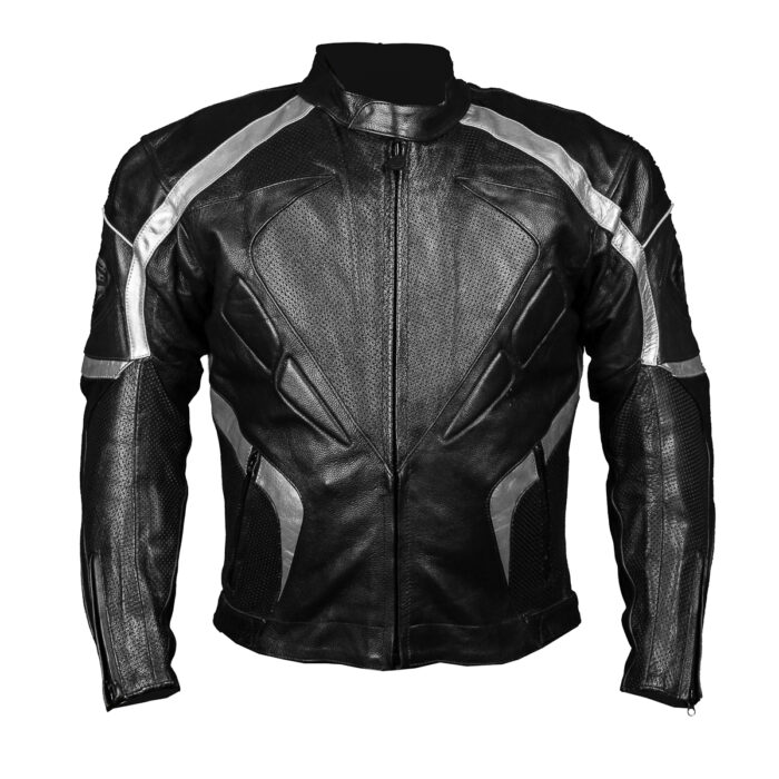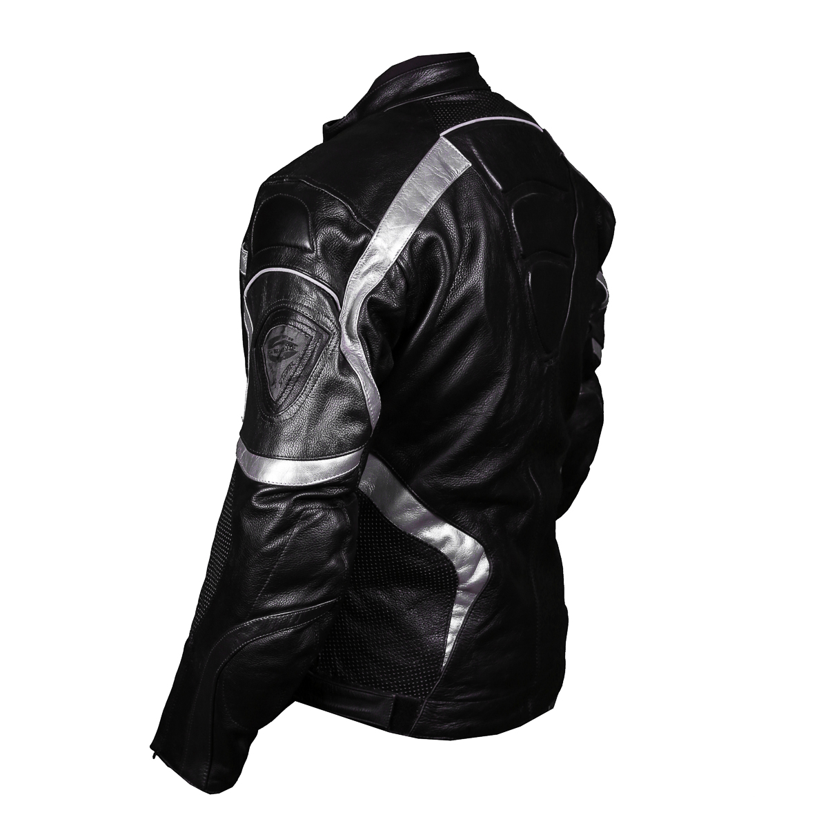 Python Motorcycle Leather Jacket is all time aggressive sports/street riding style. Features: 1.2-1.3mm soft NAPPA high TENDENCY Cow hide leather natural grain constructed with combination of perforated and non-perforated top Grain. CE approved removable Elbow/Shoulder and back armor. Perforated Front chest/sleeves and back panels for smooth Air-flow. Half sleeve zip out liner. Scotch lite reflective piping increases night time visibility. Short connection zippers to attach pant. External foam padded on Elbow for additional protection. Bottom waist sides with adjustable Velcro flaps.