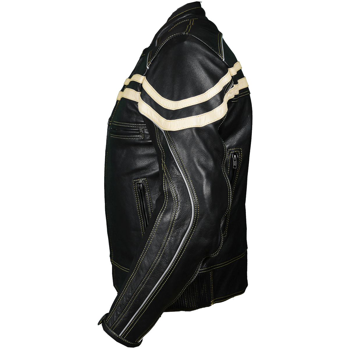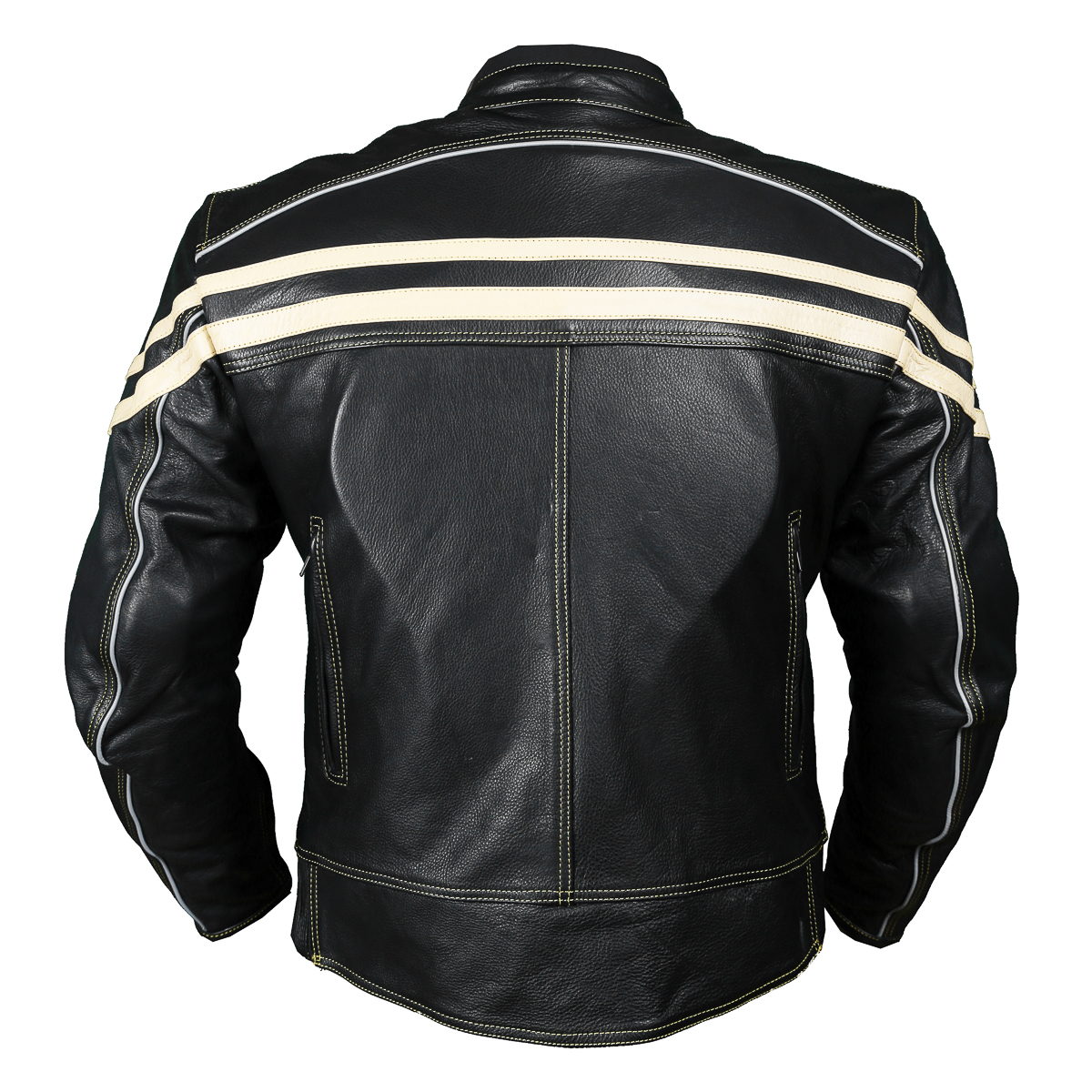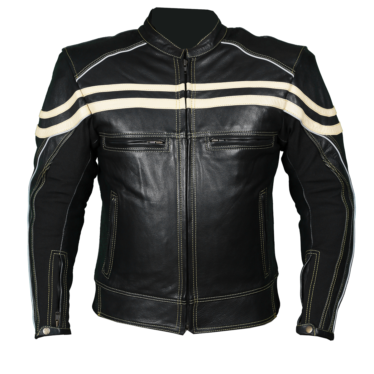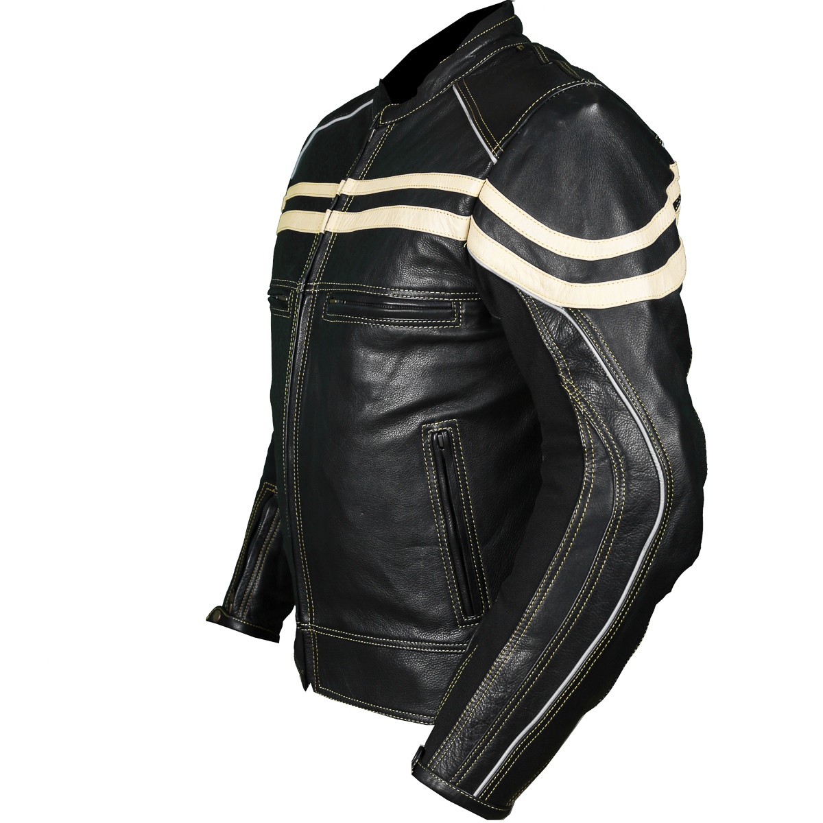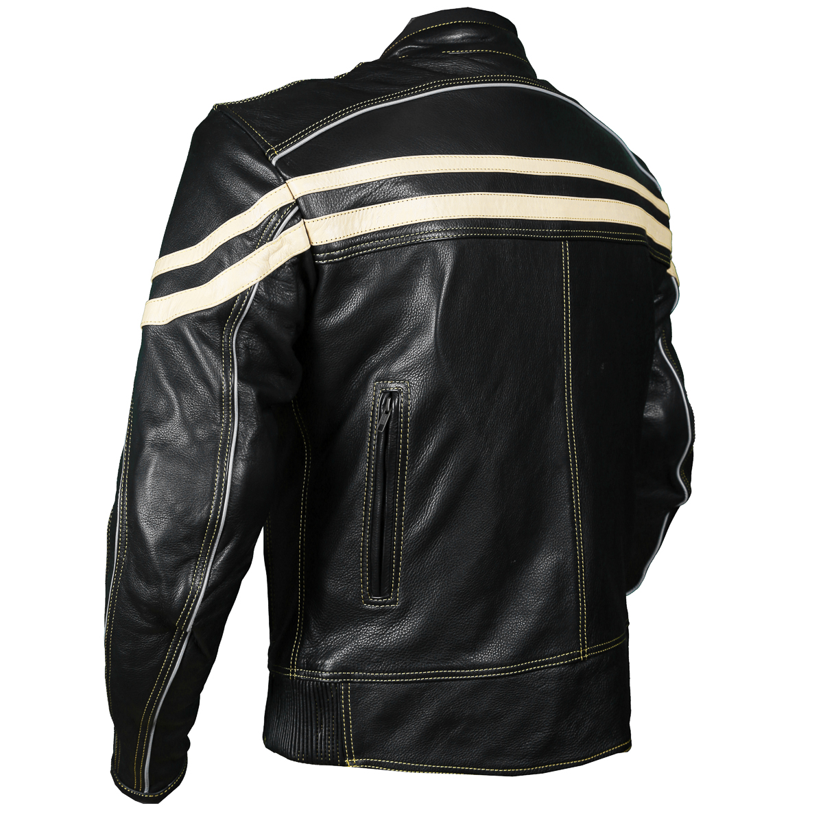 Track Motorcycle Leather Jacket is aggressive Classic Cafe Racer style. Bike or for daily use in the cold . Beige Leather front and back stripes along with matching thread and zippers make this Jacket awesome. Features: 1.2- 1.3mm soft NAPPA high TENDENCY Cow Hide Natural grain Leather. Removable CE approved Elbow/Shoulder and Back. Scotchlite Reflective piping on chest, shoulders, arms and back for night time visibility. Brass antique zippers with contrast beige double stitch thread across the Jacket for pure safety. Full sleeve removable Thermal zip out liner. 2 front Air Take in and 2 rear exit vents. Waterproof spun inner arm for comfort. Short connection zipper to attach pants.