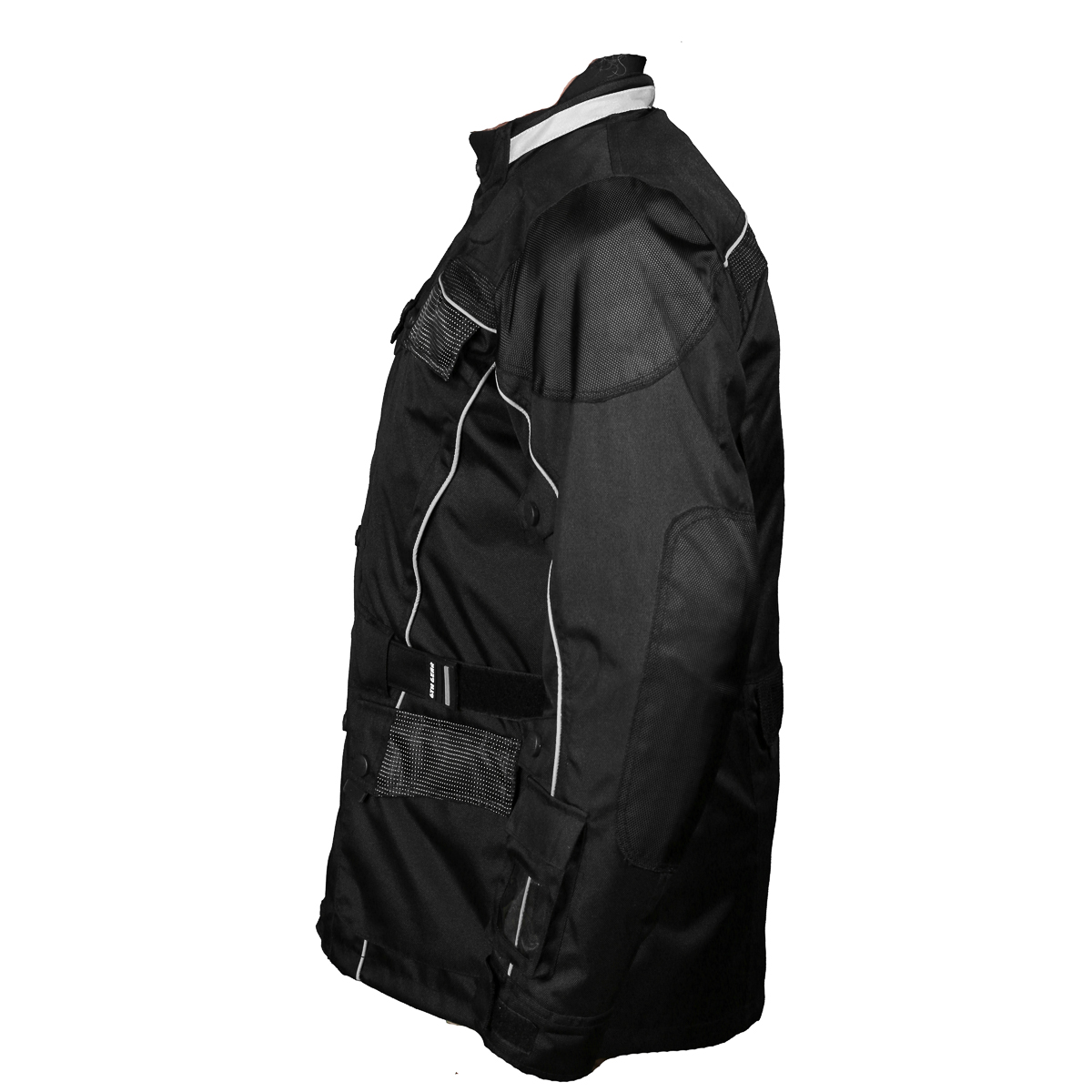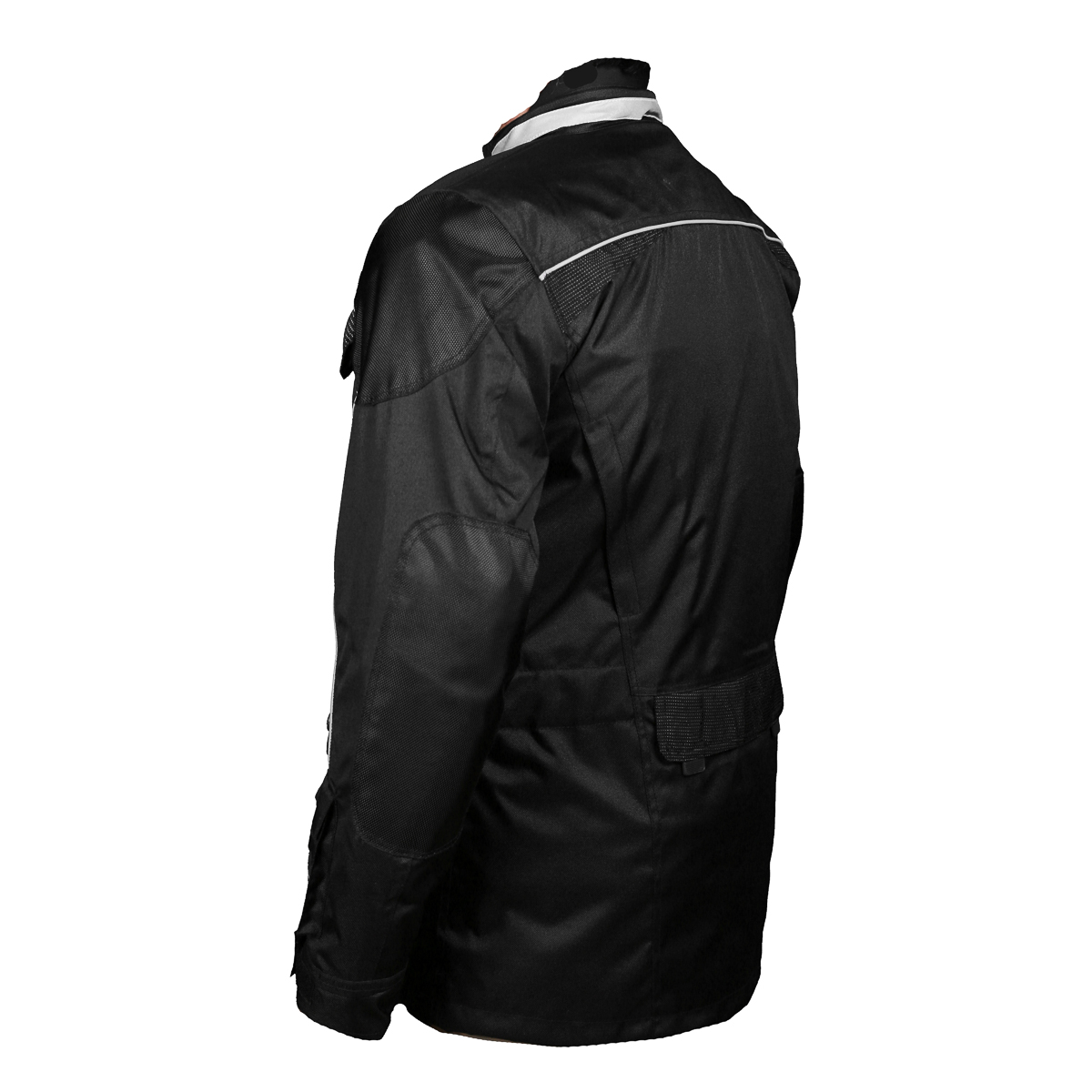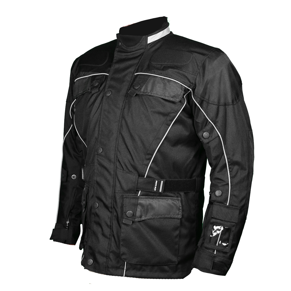 Chase Motorcycle Jacket is 3 quarter perfect Winter, Spring and Fall Jacket. 100% Water proof Breathable Membrane. Features: 600D Outer shell polyester. Thermal zip out liner, Breathable Waterproof membrane. 2 Front, 2 back Air vents, Reflective piping across the Jacket. CE Approved Elbow, Shoulder and back Armors. 9 pockets for storage. Short connection zipper to attach pants.