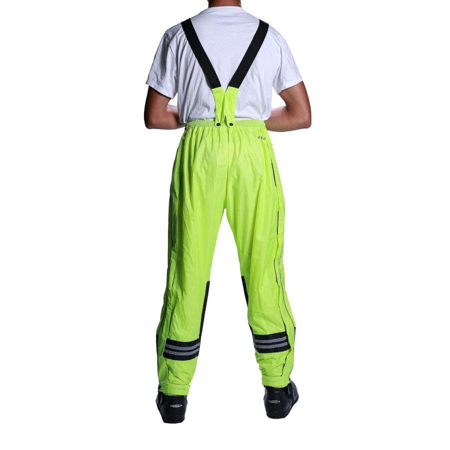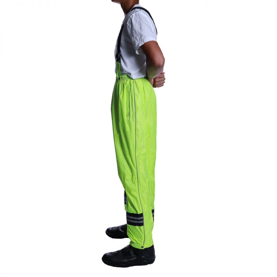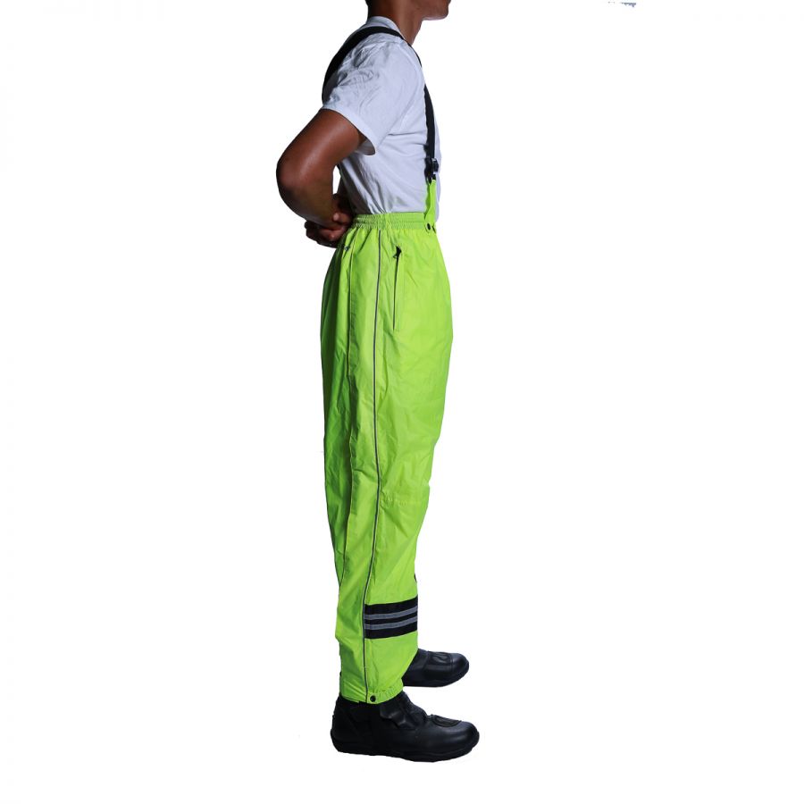 Motorcycle Rain pants are full of following Features: 400D Taffeta outer shell breathable. Full Side length zippers for easy in/out with boots. Removable Suspenders, Removable Boot straps. Exhaust pipe protection. Reflective pipping on the side leg as well as around calf for night time visibility,