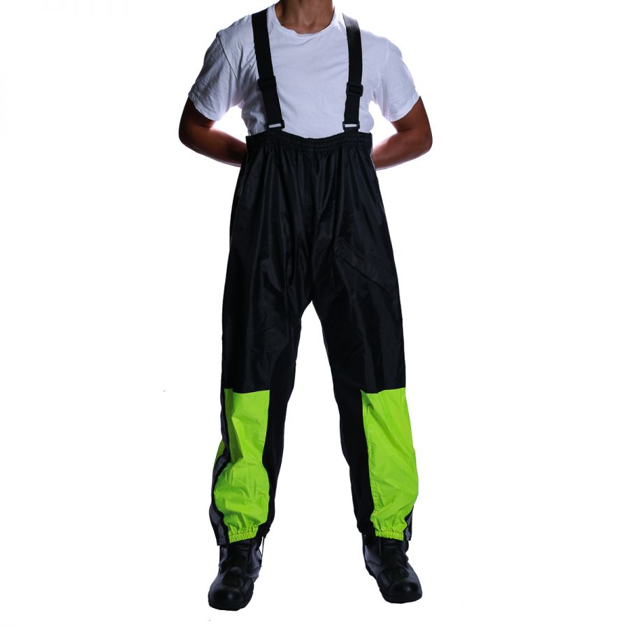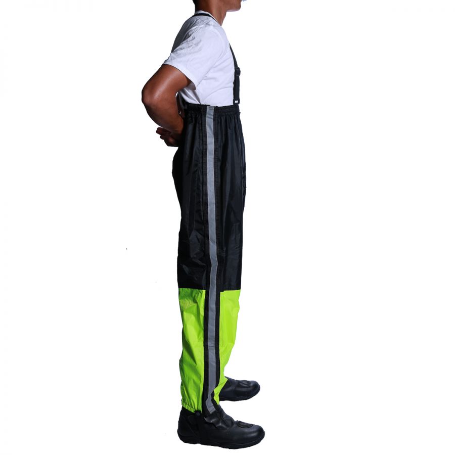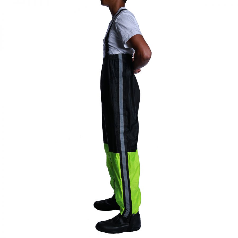 Features: Nylon Motorcycle Rain Pants. Heat shield inside legs. Non-slip seat pad. Suspenders on the pants for secure hold while riding. Full leg side length zippers for easy on/off Reflective stripes for better night time visibility. Boot straps.